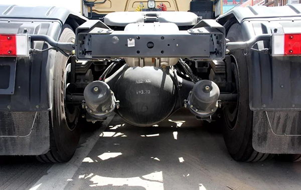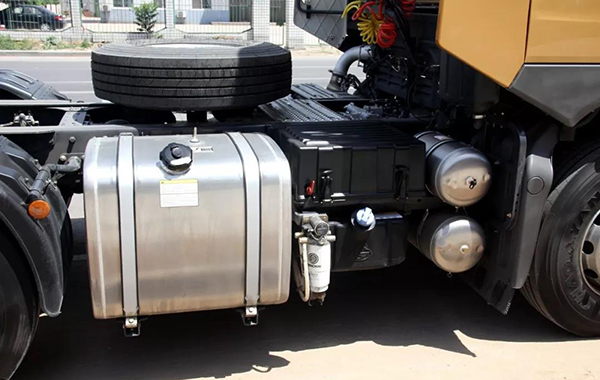 为了满足长途续航能力需求,该车配备了600L+400L的的超大铝合金燃油箱。车架右侧蓄电池和尿素箱上下叠起布置,前方则是两个叠起的铝合金储气筒,车架采用的是282单层车架。