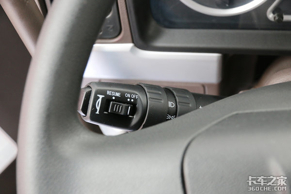 为了降低驾驶员的工作强度以及更合理的省油,乘龙T5上标配了定速巡航系统,推动位于方向盘左侧组合开关上的定速巡航开关,可以分别选择“继续上次巡航”以及“定速巡航启动”,通过旁边的旋钮可以实现定速+和定速-。